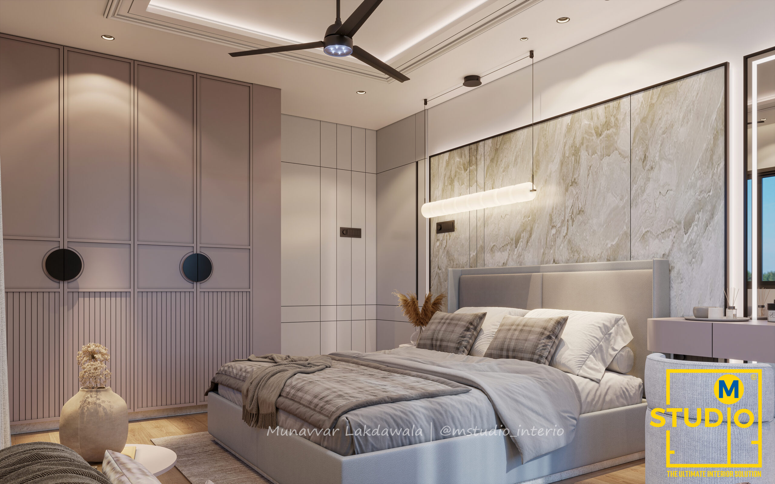 This wedding bedroom interior design by M Studio beautifully blends romance, comfort, and elegance. With soothing tones, soft lighting, and minimal furniture, the space reflects a perfect balance of luxury and coziness. Every element — from the textured wall panels to the curated décor — has been crafted to create an inviting and memorable environment for newlyweds.