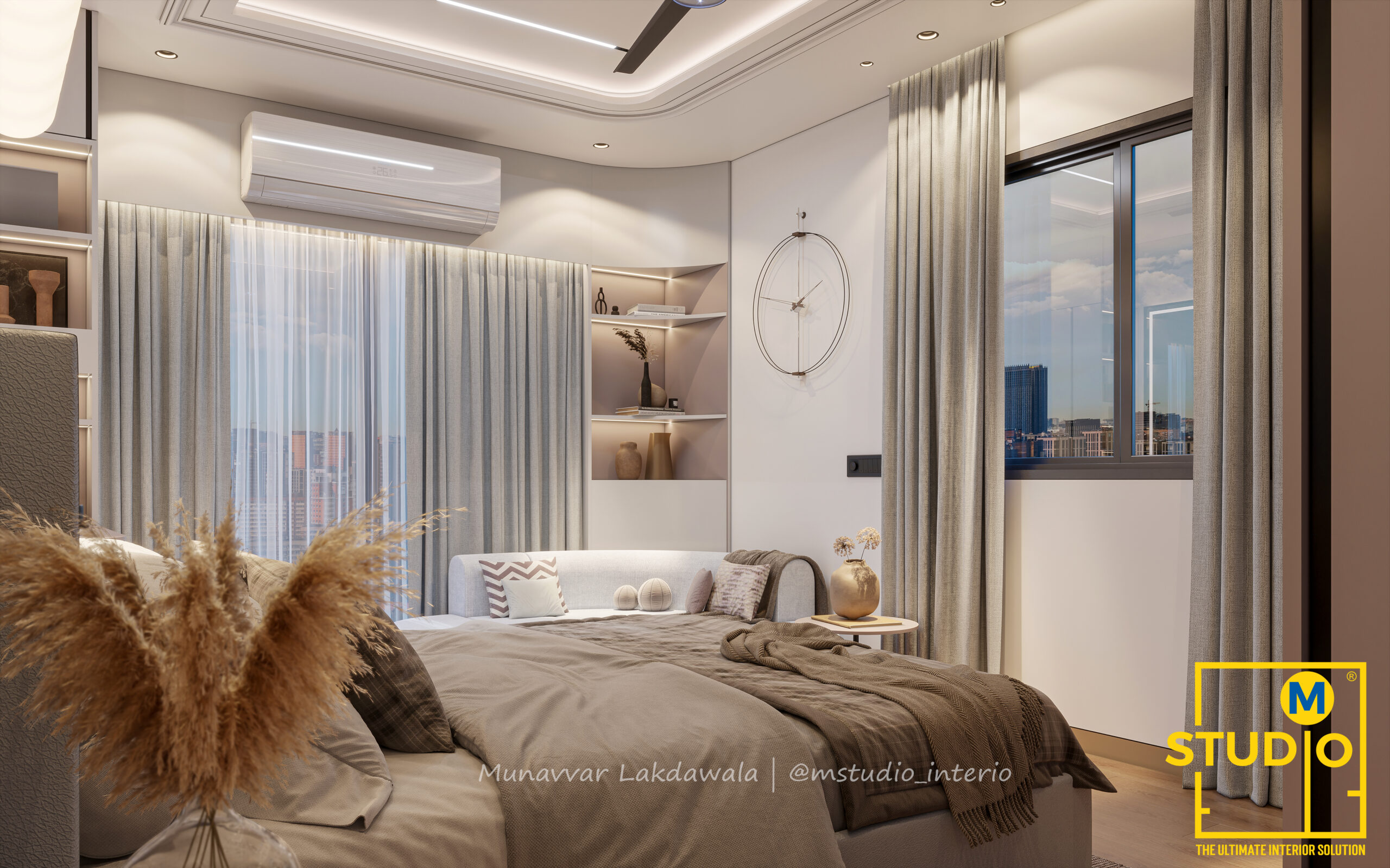 This wedding bedroom interior design by M Studio beautifully blends romance, comfort, and elegance. With soothing tones, soft lighting, and minimal furniture, the space reflects a perfect balance of luxury and coziness. Every element — from the textured wall panels to the curated décor — has been crafted to create an inviting and memorable environment for newlyweds.